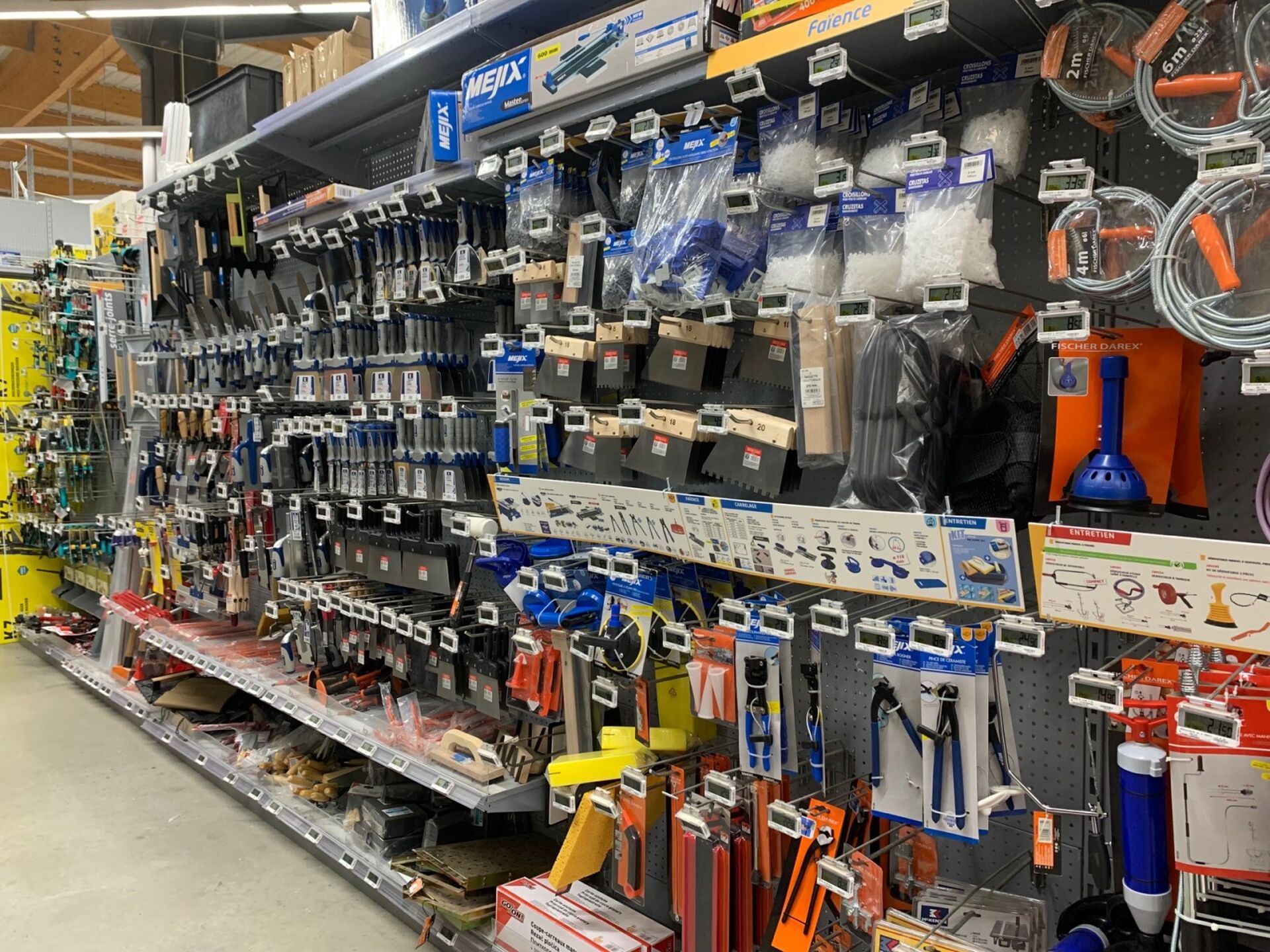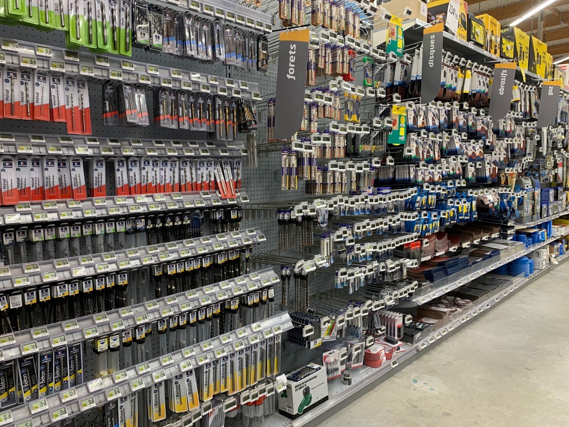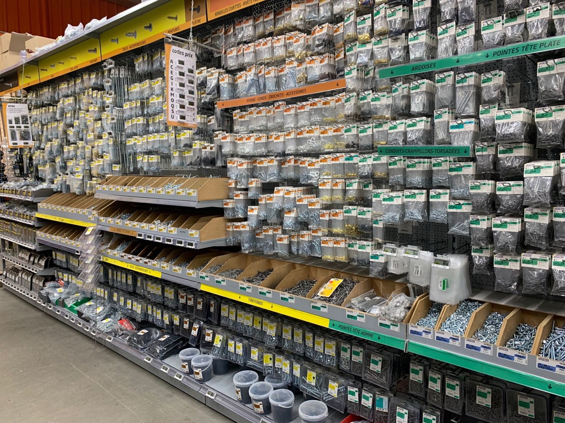Vis, chevilles, clous, tasseaux, moulures, tablettes, tournevis, mètres, niveaux, marteaux, pinces coupantes, crayons, cutters, scies, outils électroportatifs, équipements de protection individuelle, ... Vous pourrez acheter tout le