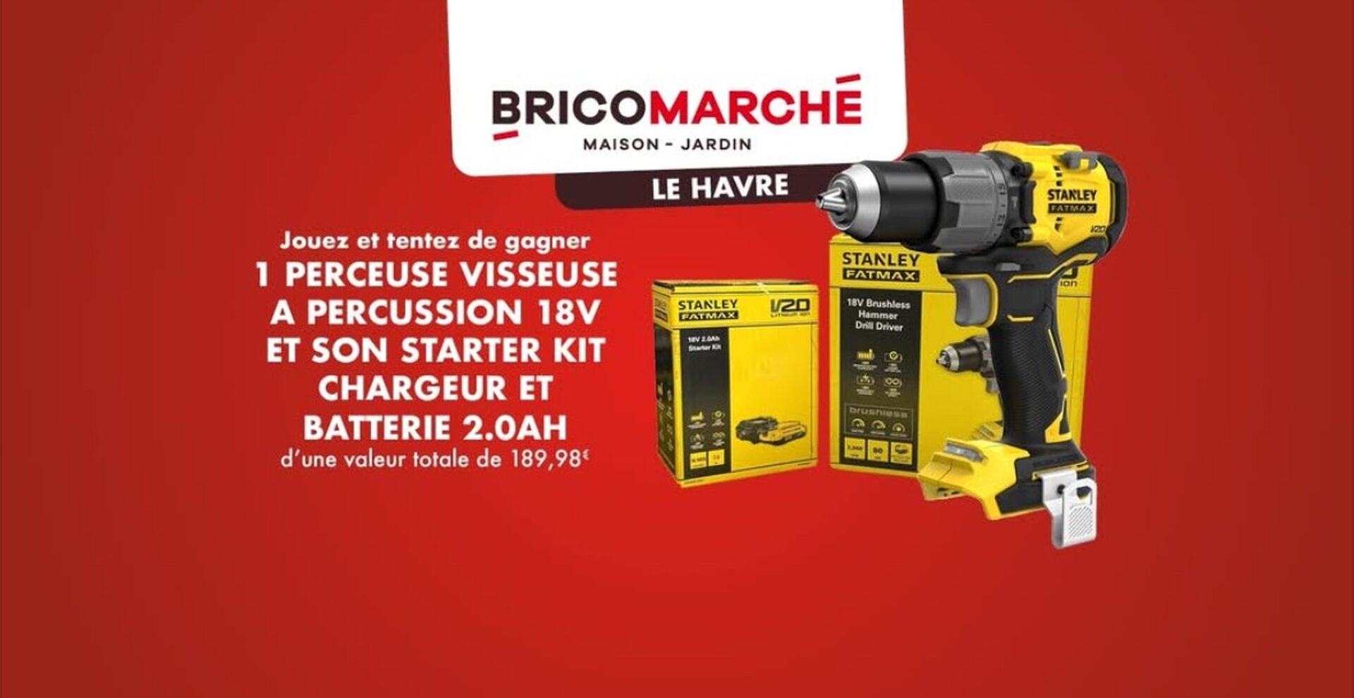 À l'occasion des fêtes de fin d'année, nous offrons une perceuse visseuse STANLEY accompagnée de son starter kit (batterie et chargeur), d'une valeur totale de 189,98 €. Un outil fiable et polyvalent, idéal pour tous vos petits et grands travaux de bricolage.