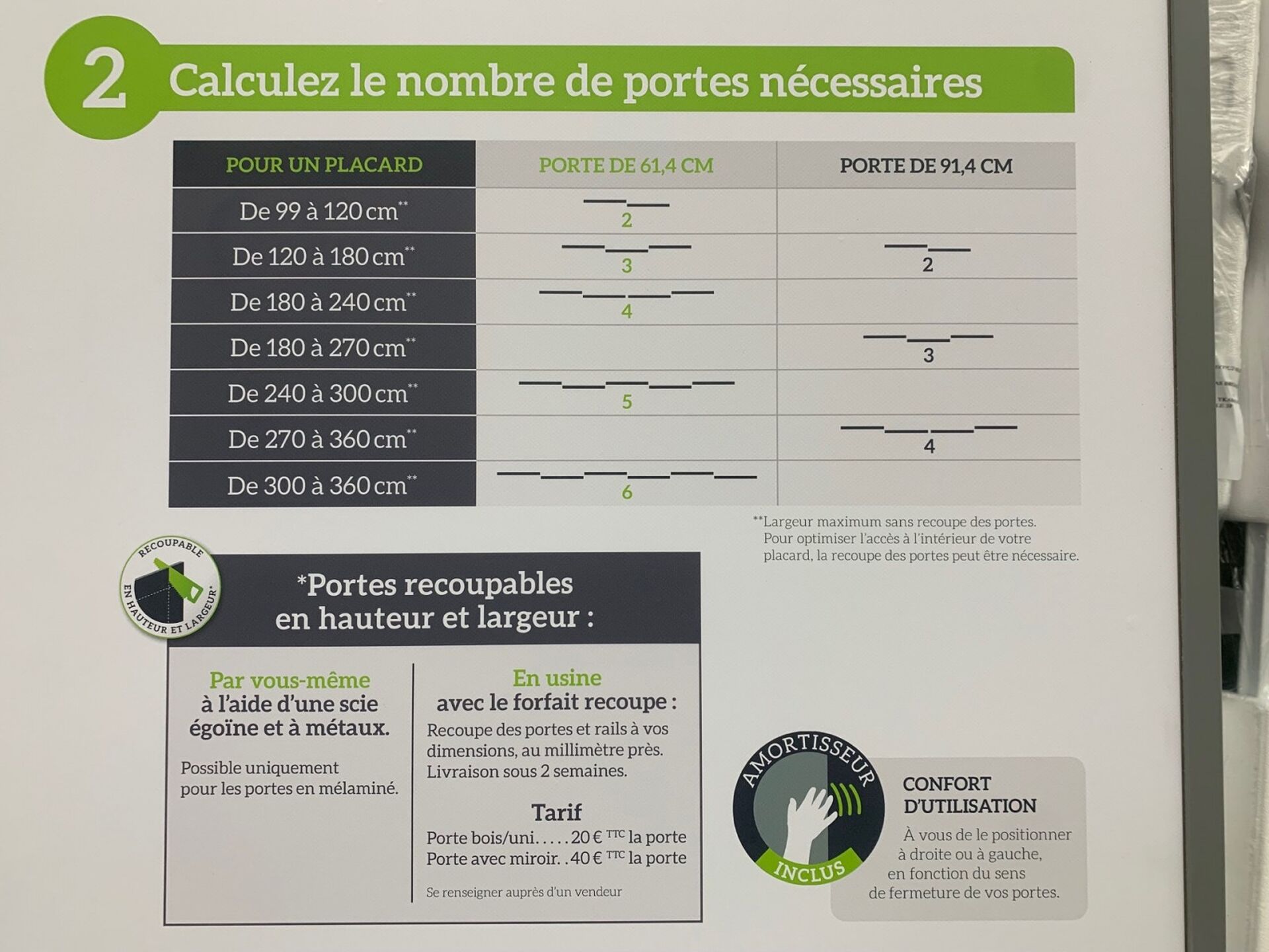 2 - Calculez de nombre de portes de placard nécessaires (voir photo) en fonction de la plus grande largeur de votre placard,