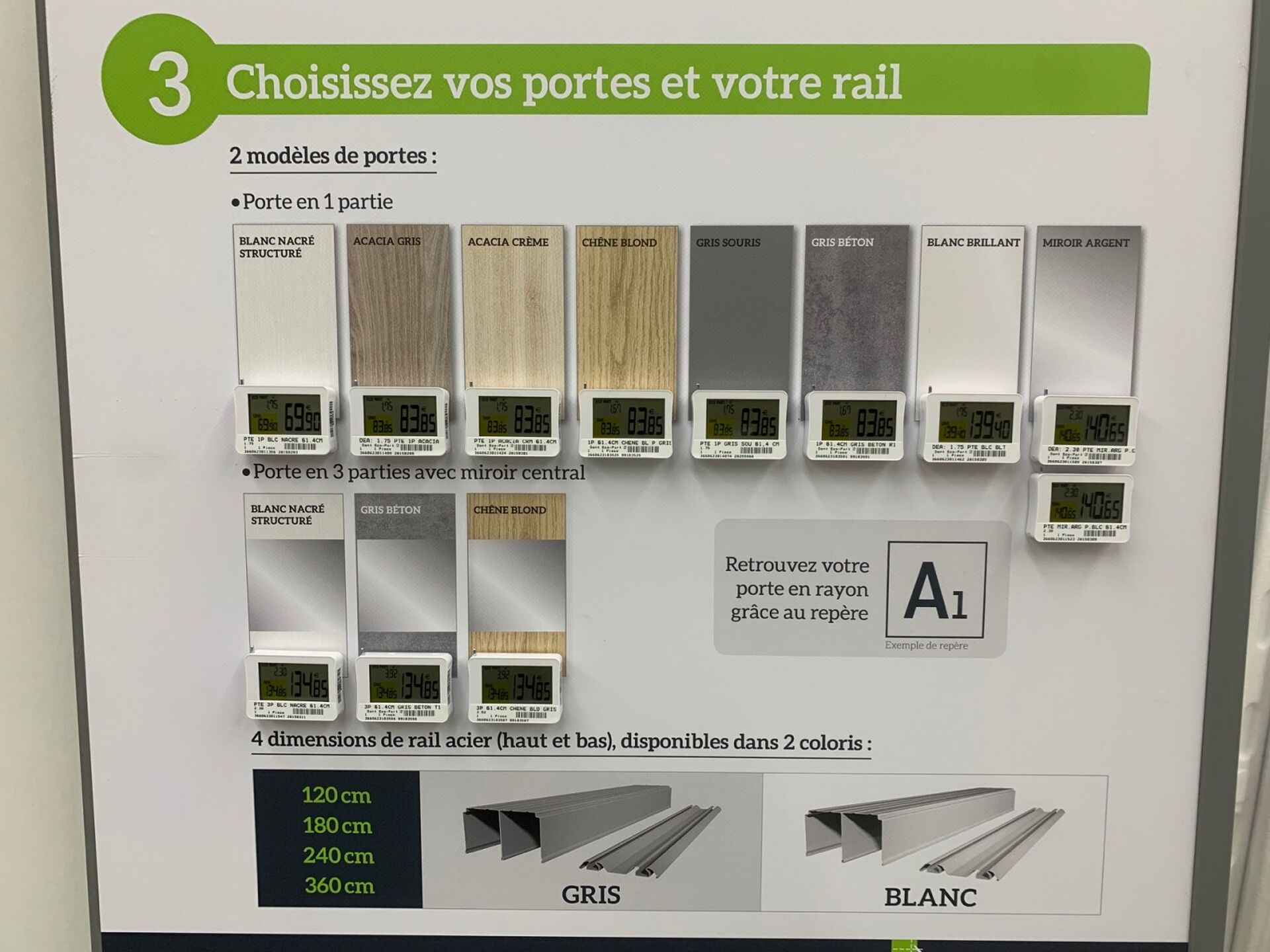 3 - Choisissez le coloris de la porte de placard et du profilé parmi les modèles exposés (portes de placard disponibles en largeur 61,4 cm ou 91,4 cm sur commande) ainsi que les rails.