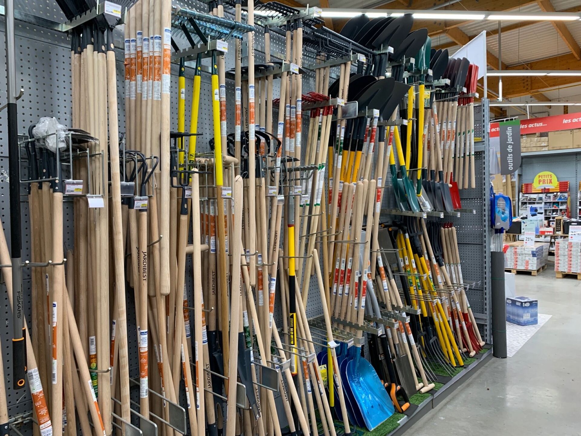 A retrouver notamment en rayon ; sécateur, cisaille, râteau, pelle, louchet, fourche, bêche, coupe branches, ratissoire à tirer, binette, hachette, etc...